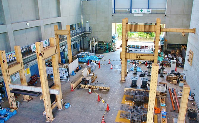 青木あすなろ建設の技術研究所は、敷地面積約18,000㎡に中に、建設面積3,000㎡延床面積約9,000㎡の管理棟と実験棟、屋外実験ヤードや骨材ヤードなどで構成されています。そこでは、建築や土木技術のほか、環境対応、防災技術など幅広い分野の技術開発をおこなっています。近年では、既設橋梁の耐震性向上技術である「DRFダンパー」が首都高速道路で実装されるなど、耐震・リニューアル分野の技術開発を進めています。今後も、持続可能な社会の実現に向け、社会に貢献できる技術の開発を続けてまいります。