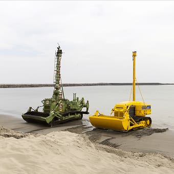 青木あすなろ建設は、1971年にコマツが開発した水陸両用ブルドーザのうち稼働中の5台を全てを保有しています。浅水域という特異性のある施工領域で、1,200件以上の施工実績を蓄積し、防災・減災・自然再生に貢献してきました。水陸両用ブルドーザは、近年全国各地で発生している集中豪雨災害や地震・火山活動に伴う土砂災害に対応するため、今後も必要不可欠な建設機械です。現在、気候変動対応等の増大する社会課題解決に向け、コマツと共同して水深50mまでを視野に、自動制御とICT機能により、熟練技術がなくとも誰もが簡単に操作が可能な電動式の水中施工ロボットの実証実験を進めております。