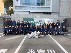 当社は今年で11回目の参加となります。青木あすなろ建設大阪土木本店・大阪建築本店勤務の役職員 43名が参加し、大阪本店ビル周辺(大阪市北区大淀南)の道路や公園で空き缶、たばこの吸い殻等のゴミ拾いを実施いたしました。