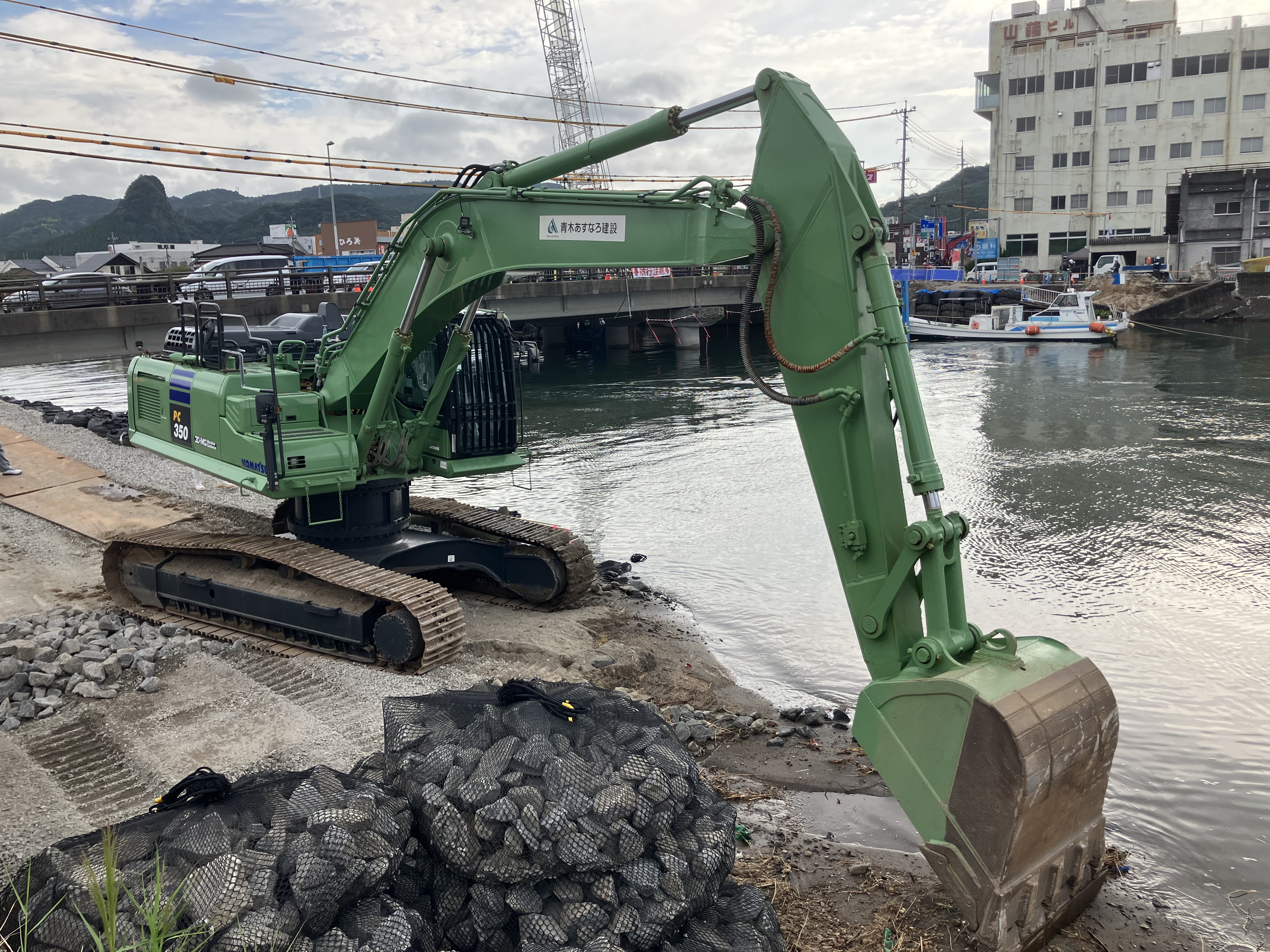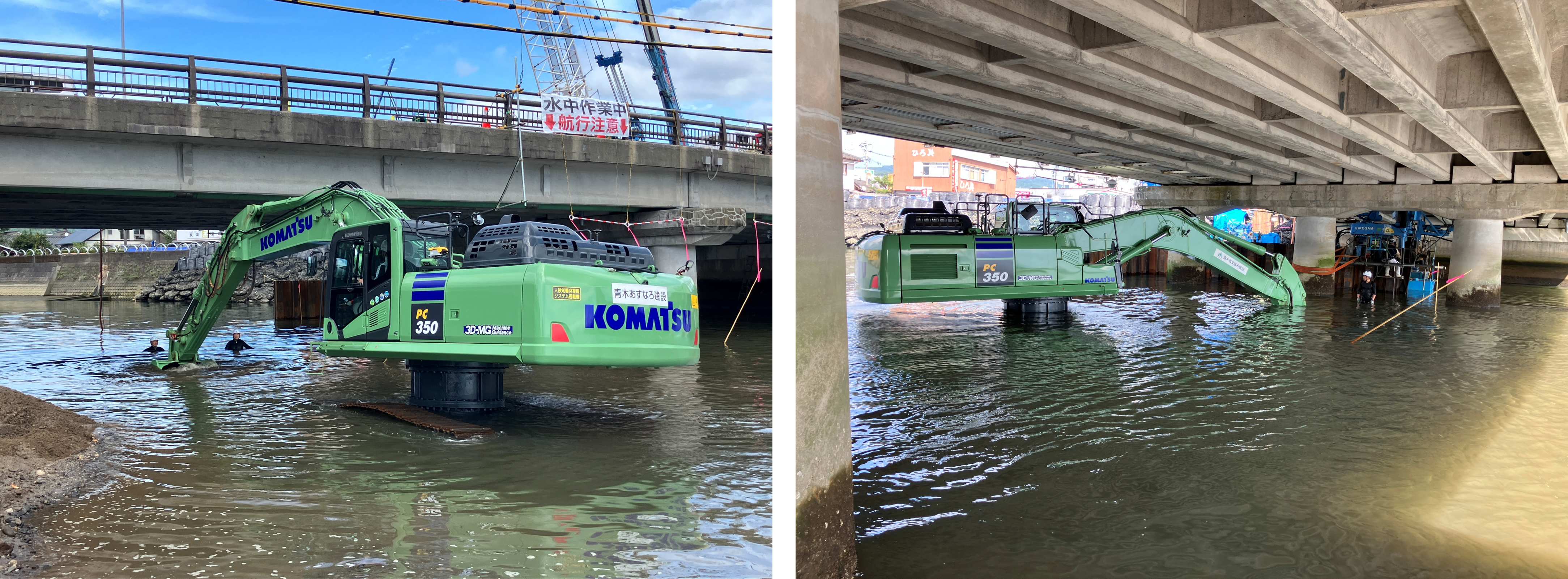 当社の水陸両用バックホウによる工事で、一刻も早い社会インフラの復旧に少しでも寄与できるよう努力してまいります。