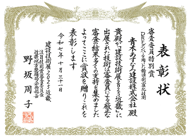 青木あすなろ建設株式会社(本社:東京都港区、代表取締役社長:望月尚幸)は、10月30日(木)および31日(金)に開催された建設技術展2025近畿において、出展企業として参加し、「DRFダンパーを用いた橋梁制震化技術」が技術展示部門において「審査委員特別賞」を受賞しました。