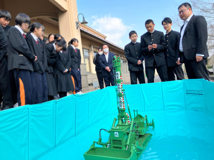出前授業では、気候変動・地球温暖化、激甚化・頻発化する自然災害、少子高齢化・担い手不足といった社会課題の解決を図る「未来の水中工事」について、水陸両用ブルドーザのラジコン操縦体験も交え、講義を行いました。