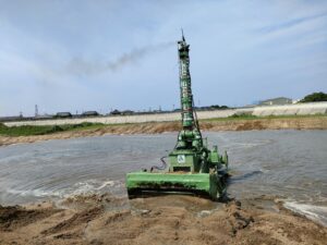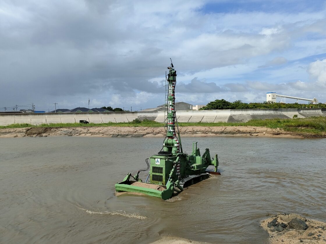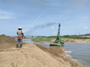 | 工事概要 | 鈴鹿川派川河口部から約700m上流区間の河道掘削工事。(今回工事は4回目)工事数量 水陸両用ブルドーザ1台施工 掘削押土工V=8300m3(余掘り込)(平均押土L=62m) |