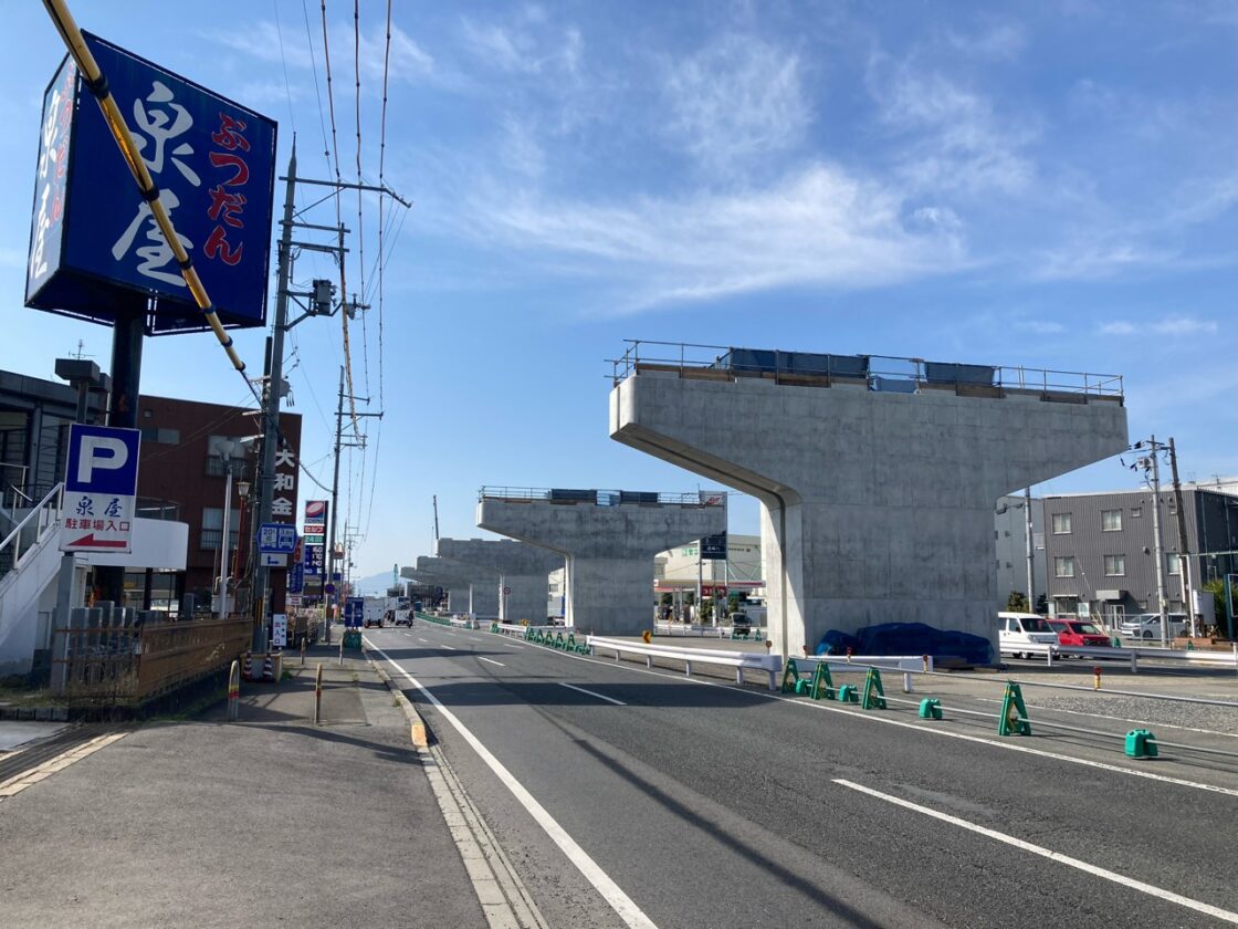 | 工事概要 | 工事延長:L=3,320m 【橋梁下部工】5基 基礎杭場所打ちCONφ1,200(64本)L=1,424m、鋼管ソイルセメント杭φ1200(22本)L=473m、構造物掘削V=4,857㎥、基礎材V=135㎥、躯体CON V=3,971㎥、型枠A=2,435㎡、鉄筋899.971t、特殊支保工903.617kg、PC鋼材引張 23.223kg、剥落防止対策工A=863㎡ 【国道24号路肩・中央分離帯改良】1式 【仮設工】1式 |