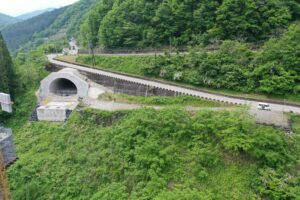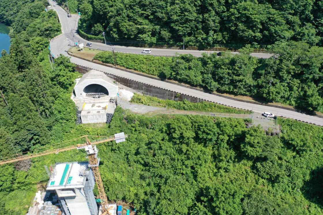 | 工事概要 | 道路トンネル L=2,550m、NATM工法発破方式、掘削L=958m、覆工1,117.3m、インバート工649.5m、坑門工1基、掘削補助工、仮設備工残土処理工、水槽工、排水構造物工、擁壁工 |